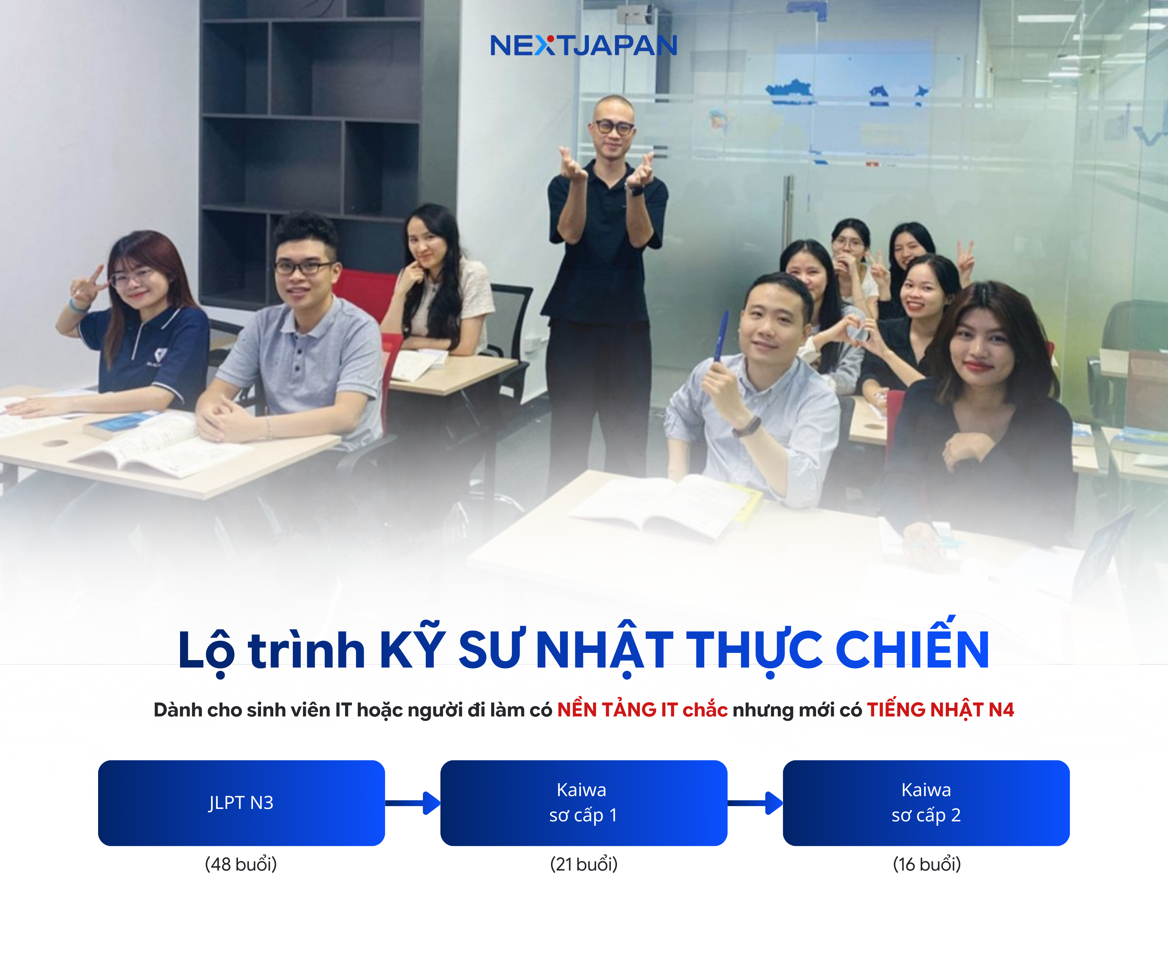 Cam kết thi đỗ JLPT N3, đáp ứng yêu cầu của đa số job IT Nhật.